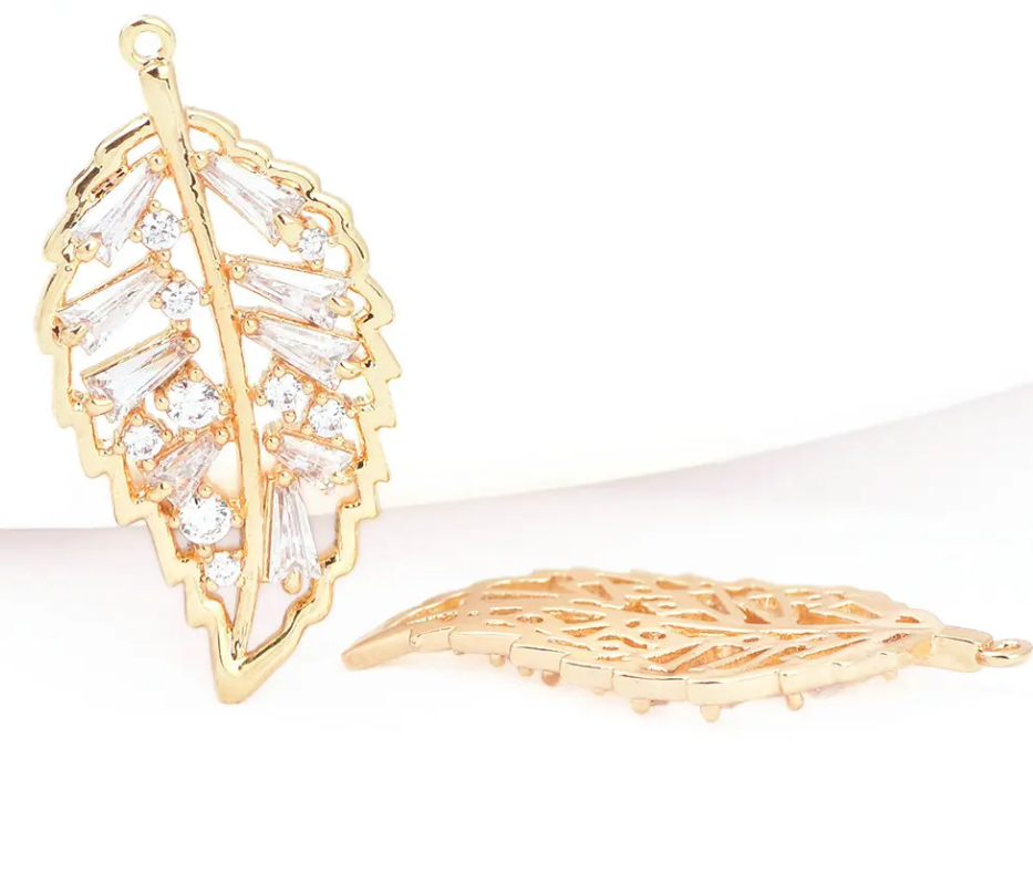 LUX Подвеска Лист с кристаллами 27*14 мм, латунь, позолота 1 шт